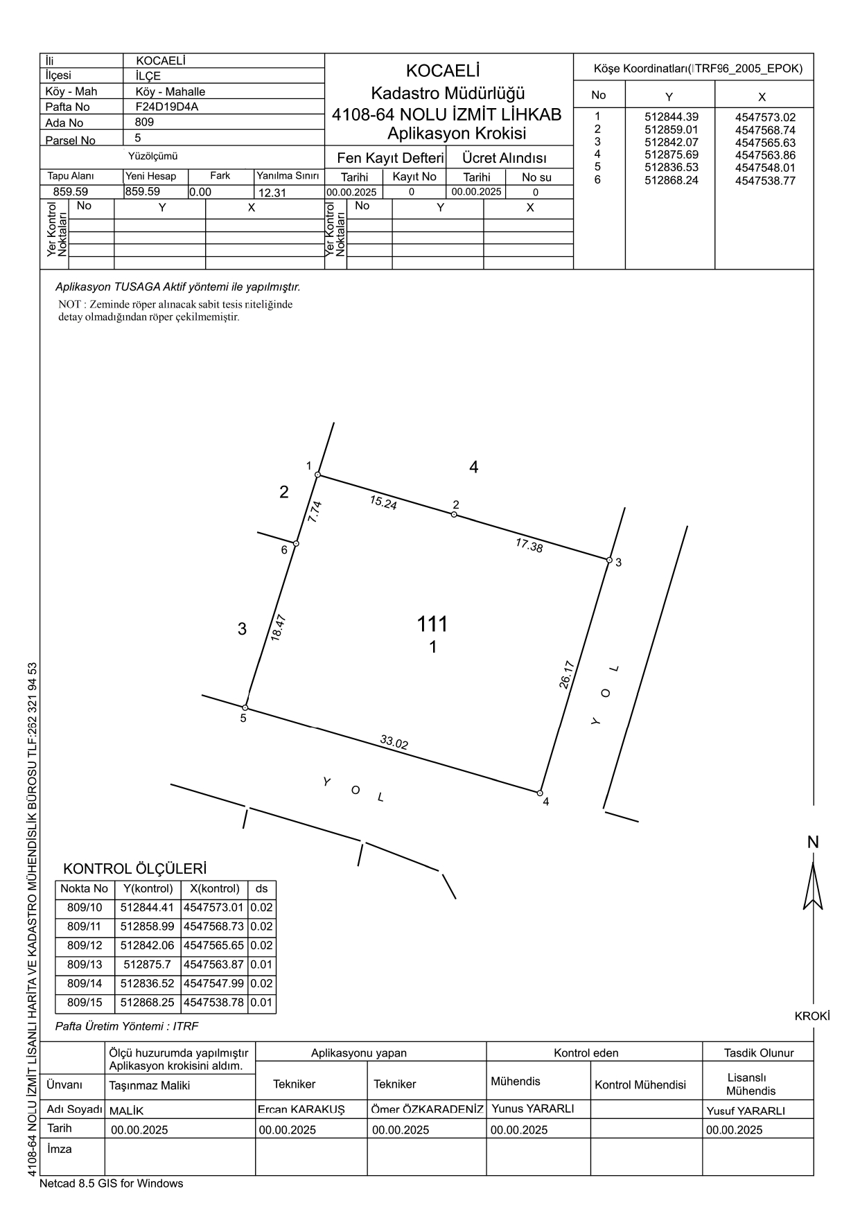 Aplikasyon: Taşınmaza ait mülkiyet, irtifak hakkı ve yol sınırlarının, tescilli tapu planındaki bilgi ve belgelerine uygun olarak zeminde işaretlenmesi işlemidir.